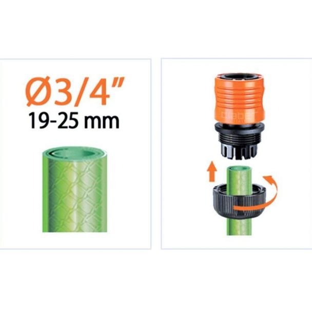 - Conectare rapidă – sistem snap-on pentru montaj şi demontaj fără scule, economisind timp la schimbarea accesoriilor de irigare.