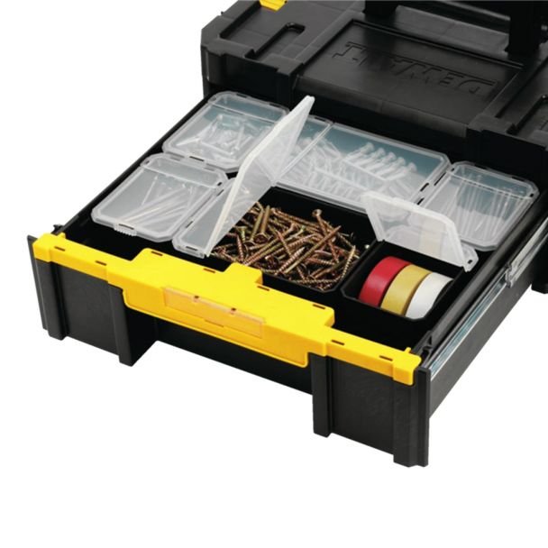 Cutia organizator este un produs din categoria sistemelor modulare de depozitare pentru scule și accesorii, identificată ca DeWalt DWST1-70705, TSTAK III. Concepută pentru organizarea și transportul componentelor mici (șuruburi, piulițe, burghie, piese de fixare), oferă acces rapid printr-un sertar frontal care facilitează preluarea uneltelor și consumabilelor în atelier, pe șantier sau în aplicații mobile de întreținere.
