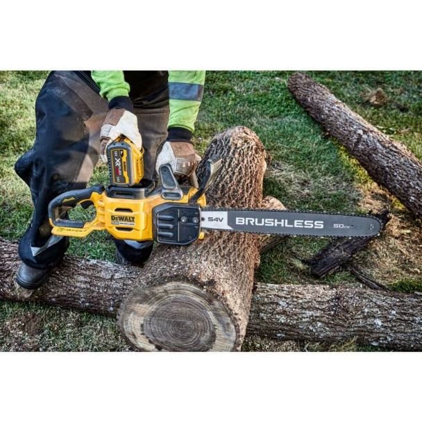 Este echipat cu o șină de 50 cm, ideală pentru tăieri de busteni și trunchiuri groase, și este compatibil cu acumulator XR FLEXVOLT 54V, ceea ce permite utilizarea sistemului de baterii DeWalt 54V pentru autonomie și putere adecvate lucrărilor solicitante. Configurația aceasta oferă flexibilitate în operare și avantajul operării fără sursă de alimentare fixă.