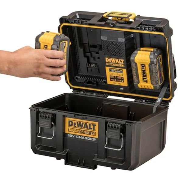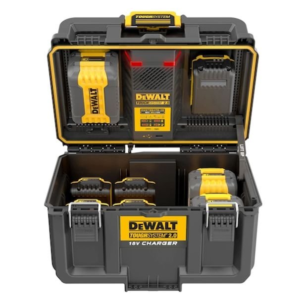 Dispozitivul este proiectat pentru compatibilitate cu acumulatori 18V XR şi 54V FlexVolt, oferind flexibilitate în utilizare între sculele din gama XR şi FlexVolt. Cutia TOUGHSYSTEM aduce protecţie mecanică şi organizare a echipamentelor, facilitând manipularea, stivuirea şi transportul sigur al bateriilor în mediile de lucru solicitante.