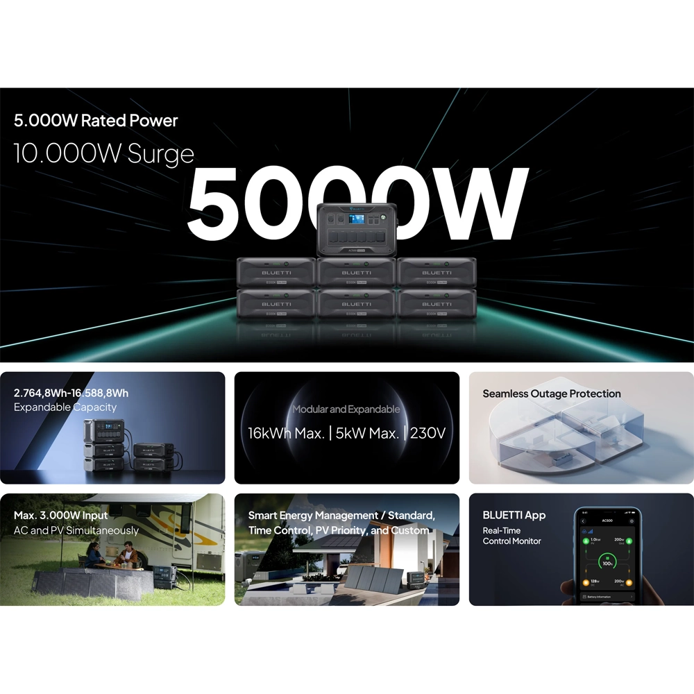 BLUETTI AC500 este un invertor modular de ultimă generație, conceput pentru a oferi o sursă de energie puternică, sigură și flexibilă, adaptată atât pentru uz casnic, cât și pentru aplicații off-grid. Cu o putere de 5000 W și o arhitectură complet modulară, AC500 este ideal ca sistem principal de alimentare sau ca backup de urgență pentru întreaga locuință.