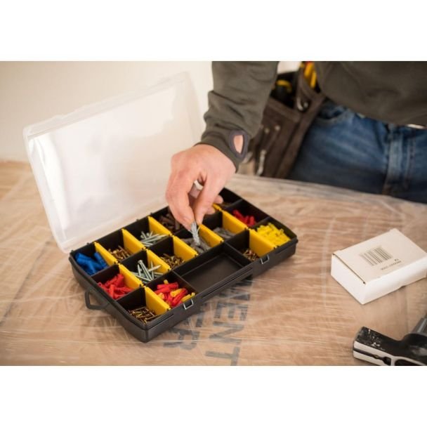 Organizator pentru accesorii destinat depozitării și sortării pieselor mici din ateliere, truse de scule și spații de bricolaj. Produsul este clasificabil ca organizer pentru accesorii și oferă o soluție compactă pentru separarea și păstrarea şuruburilor, piulițelor, şaibelor şi altor consumabile de dimensiuni reduse.