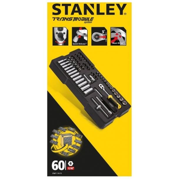 Setul de înșurubare Stanley STMT1-74175 este un set compact de scule pentru lucrări de strângere și montaj, clasificabil ca set de antrenoare și accesorii pentru înșurubare. Produsul conține în total 60 piese și este proiectat pentru utilizare cu prinderi standard 1/4″, oferind compatibilitate largă cu șurubelnițe manuale și electrice echipate cu prindere de 1/4″.