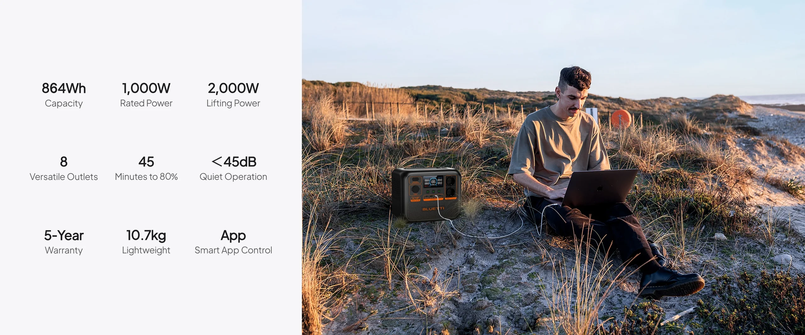 BLUETTI AC70P este o stație de energie portabilă de nouă generație, creată pentru a oferi putere fiabilă și autonomie extinsă în camping, excursii, rulote sau ca sursă de rezervă pentru locuință. Cu o capacitate de 864 Wh și o putere continuă de 1000 W (până la 2000 W peak cu tehnologia Power Lifting), poate alimenta simultan o gamă largă de dispozitive și electrocasnice.