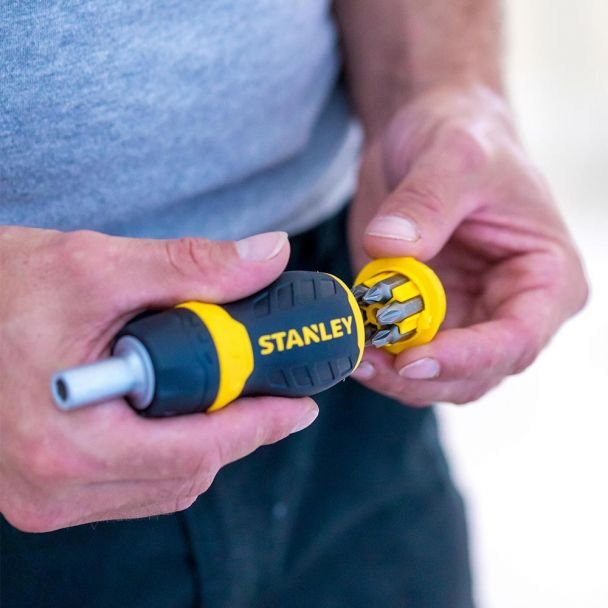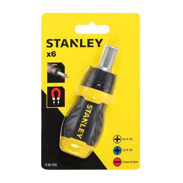 Surubelnita Stubby cu clichet si 7 biti Stanley 0-66-358, are mâner compact pentru acces în spații strâmte, clichet reversibil pentru lucru rapid și precis, set de 7 biți din oțel rezistent, suport magnetic pentru biți și prindere rapidă, mâner antialunecare ergonomic, ideală pentru instalații solar, lucrări în autorulotă, întrețineri pe barcă și ca unealtă de backup în trusa auto și cea de acasă.