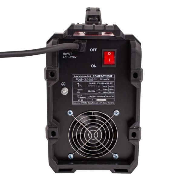 Invertor de sudură tip MMA, model Tehnoweld COMPACT-280T, proiectat pentru operațiuni de lipire prin arc cu electrozi în gama 1.6–4 mm. Dispozitivul furnizează un curent maxim de 220 A, adecvat pentru lucrări de întreținere, reparații și execuții metalice ușoare-mediu industrial sau atelier profesionist.